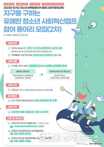 경기헤드뉴스 성미연 기자 | 경기도와 경기도사회적경제원이 8월 25일 오후 6시까지 사회혁신 사고와 창의성을 발휘하는 청소년 인재 양성을 위한 사회적경제 교육과정 ‘지구를 구하는 유쾌한 사회혁신캠프’에 참여할 청소년동아리를 모집한다.