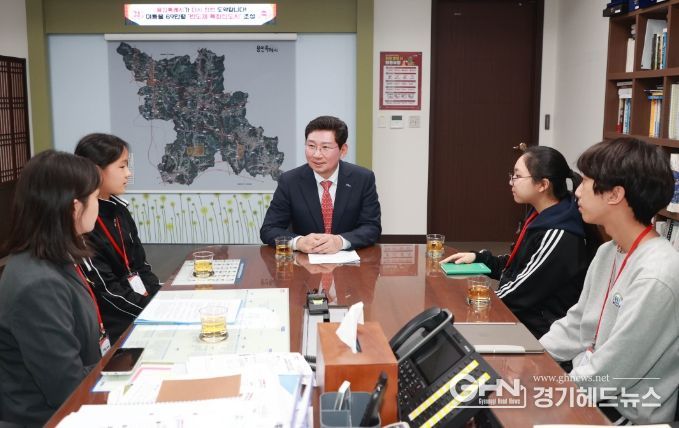 이 시장은 인터뷰를 위해 시장실을 찾은 강인찬(한숲중)‧서하윤(문정중)‧김수현(나곡중)‧최서영(용인중) 학생들에게 장래 희망을 물어보고, 응원의 뜻을 전했다.