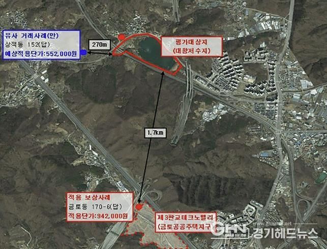 성남시 조사 결과, ‘감정평가 실무기준’(국토교통부 고시)에서는 ‘주변 환경이 유사하고 지리적으로 인접한 거래사례’를 적용하도록 규정하고 있음에도 불구하고, 약 1.7km 떨어진 금토동 공공주택지구 인근 토지를 평가사례로 적용하는 등 객관성과 타당성이 부족한 평가가 이루어진 사실을 확인했다. 그 결과 약 330억원의 시민 세금이 과다 지출된 것으로 판단하고 있다.