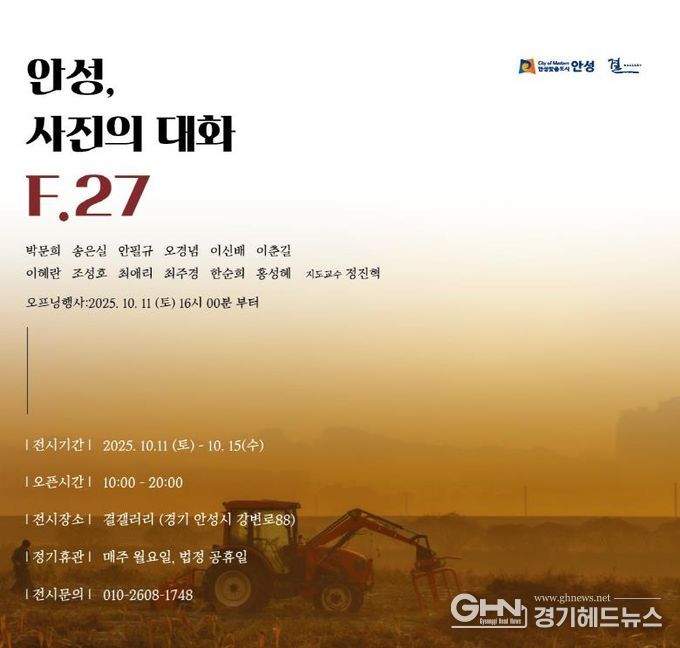 경기헤드뉴스 임수연 기자 | 안성시 사진동아리 F.27 photo가 오는 10월 11일부터 15일까지 안성천 작은미술관 결갤러리에서 전시회 ‘안성, 사진의 대화 F.27’을 개최한다. 이번 전시는 동아리 회원 18명이 참여해 안성의 자연환경과 사람들의 이야기를 기록한 작품을 선보인다.