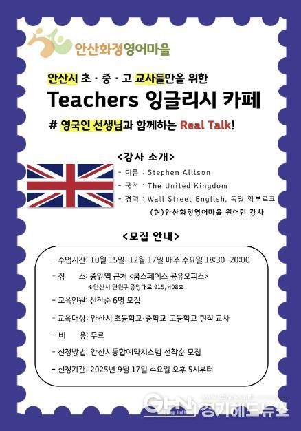 경기헤드뉴스 성미연 기자 | 안산시 안산화정영어마을은 오는 15일부터 12월 17일까지 관내 소속 교사를 대상으로 ‘티처스(Teachers) 잉글리시 카페’를 운영한다고 10일 밝혔다.