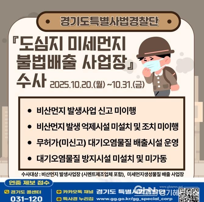 경기헤드뉴스 성미연 기자 | 경기도 특별사법경찰단은 오는 20일부터 31일까지 2주간, 도심지 내 미세먼지 주요 발생 사업장을 대상으로 불법행위를 집중 수사한다.