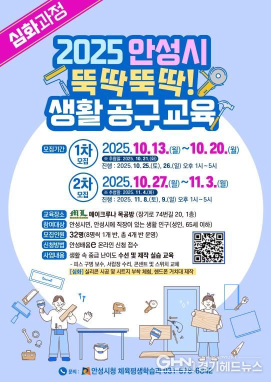 경기헤드뉴스 성미연 기자 | 안성시는 시민들의 생활 자립 역량 강화를 위해 '뚝딱뚝딱 생활 공구[심화과정] 교육'을 오는 10월 25~26일과 11월 8~9일, 총 2회 주말 일정으로 운영한다고 밝혔다.