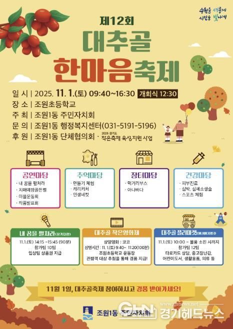 경기헤드뉴스 임수연 기자 | 수원시 장안구 조원1동 주민자치회와 조원1동 단체협의회는 오는 11월 1일, 지역 주민이 함께 어울리는 ‘제12회 대추골 한마음 축제’를 개최한다.