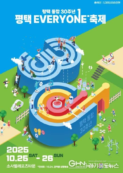 경기헤드뉴스 임수연 기자 | 평택시는 평택시 통합 30주년을 기념해 오는 25일부터 26일까지 이틀간 소사벌레포츠타운 일원에서 '평택 통합 30주년, 평택 EVERYONE 축제'를 개최한다고 밝혔다.