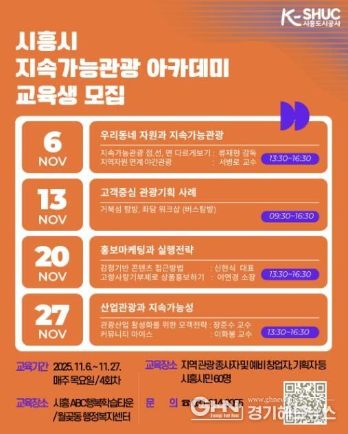 이번 아카데미는 ‘지속가능 관광, 지역에서 배우고 실현하다!’를 슬로건으로, 지역 관광 종사자, 예비 창업자, 기획자 등 시흥시민 60명을 대상으로 진행된다. 교육은 오는 2025년 11월 6일부터 11월 27일까지 총 4회에 걸쳐서, 시흥 ABC행복학습타운 및 월곶동 행정복지센터에서 매주 목요일에 진행된다