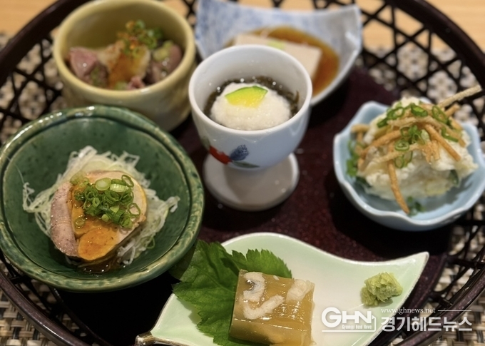 이날 점심 오마카세 코스는 메뉴판 없이, 셰프가 구성한 흐름대로 이어졌다. 시작은 검은 소쿠리에 담긴 여섯 가지 전채 요리였다. 닭근위 소금구이는 고소한 지방과 쫄깃한 식감의 균형이 좋았고, 아귀간(안키모)은 절제된 간장 소스와 어우러져 부드럽게 녹아내렸다. 직접 만든 깨두부, 감자 샐러드, 마무침과 해초초무침 등은 입 안의 온도를 천천히 조율하며 다음을 준비시킨다.