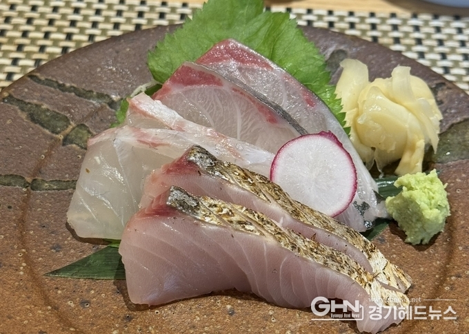 사시미는 줄무늬 전갱이를 중심으로 구성되었고, 정확한 어종을 모두 식별하기는 어려웠지만 껍질을 살짝 그을리거나 숙성 방식을 달리한 구성에서 셰프의 섬세한 감각이 드러났다.