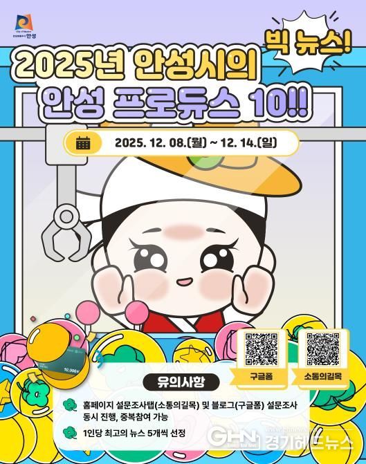 경기헤드뉴스 임수연 기자 | 안성시는 8일부터 14일까지 7일간 ‘2025년을 빛낸 안성시 10대 뉴스’ 선정을 위한 온·오프라인 시민 투표를 진행한다고 밝혔다.