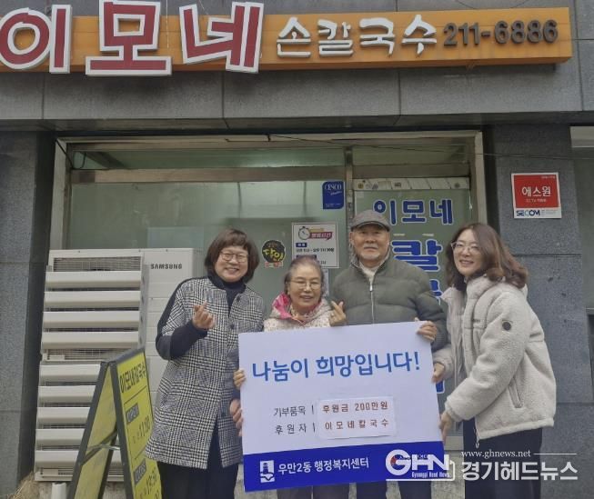 최영문 우만2동장은 “경기가 좋지 않음에도 해마다 후원을 이어오는 것이 결코 쉬운 일이 아니다”라며 “이모네칼국수의 따뜻한 나눔이 지역사회에 큰 울림을 주고 있으며, 홀몸어르신 복지 향상에 실질적인 도움이 되고 있다”고 감사의 뜻을 밝혔다.