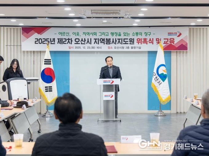 경기헤드뉴스 임수연 기자 | 오산시는 지난 23일 오산시청 물향기실에서 신규 경로당 회장을 대상으로 한 '2025년 지역봉사지도원 위촉식'을 개최했다고 밝혔다.