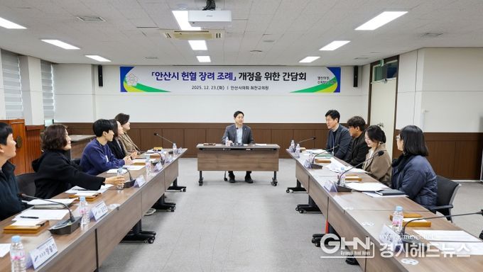 경기헤드뉴스 임채헌 기자 | 안산시의회 최찬규 시의원(사동·사이동·해양동·본오3동)은 지난 23일 안산시의회 3층 대회의실에서‘안산시 헌혈 장려 조례’ 개정을 위한 간담회를 개최했다.