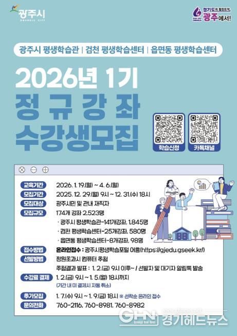 경기헤드뉴스 권민성 기자 | 광주시는 12월 29일부터 31일까지 평생학습관, 검천평생학습센터 및 읍면동 평생학습센터에서 운영하는 2026년 제1기 평생학습 프로그램 수강생을 모집한다고 26일 밝혔다.