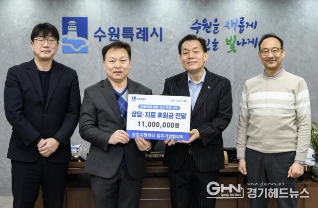 경기헤드뉴스 권준형 기자 | 수원시 창업지원센터 입주기업협의회가 “학대 피해아동 지원에 사용해 달라”며 수원시에 후원금 1100만 원을 전달했다. 전달식은 30일 이재준 수원시장 집무실에서 열렸다.