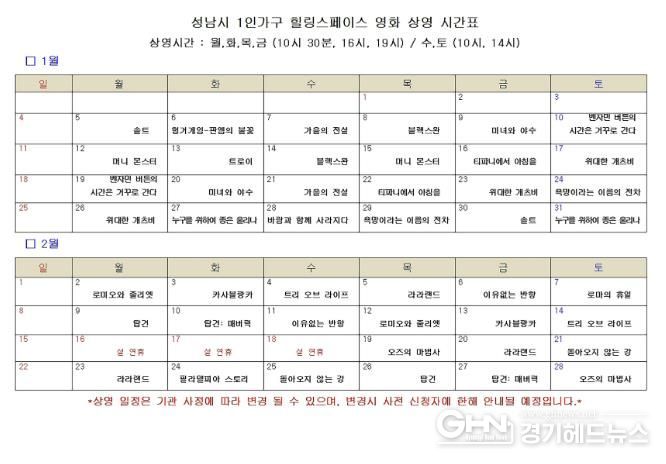 경기헤드뉴스 권준형 기자 | 성남시는 오는 2월 28일까지 1인 가구 힐링 스페이스 커뮤니티 홀(중원구 둔촌대로 100 4층)에서 ‘추억의 할리우드 영화’를 총 120회 무료 상영한다.