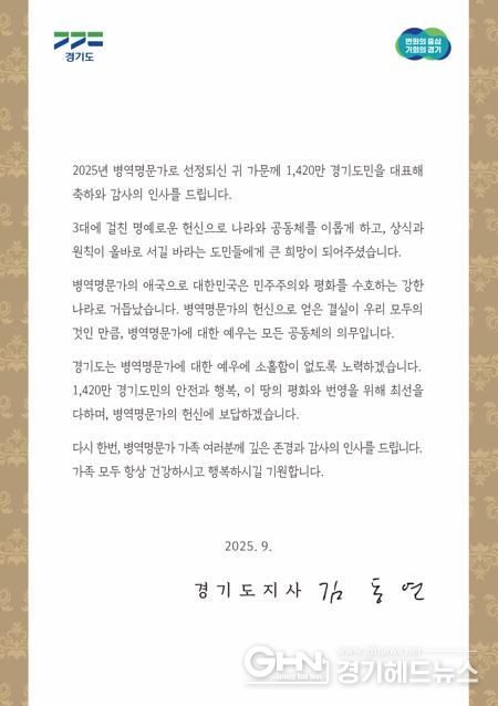김동연 경기도지사는 서한문을 통해 “병역명문가의 애국으로 대한민국은 민주주의와 평화를 수호하는 강한 나라로 거듭났다”면서 “경기도는 병역명문가에 대한 예우에 소홀함이 없도록 노력하겠으며, 헌신에 보답하겠다”고 감사와 존경의 뜻을 표현했다.