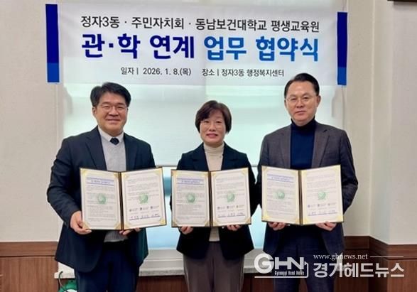 경기헤드뉴스 권준형 기자 | 수원시 장안구 정자3동 행정복지센터와 주민자치회는 지역 내 협력 기반을 구축해 주민 맞춤형 프로그램을 확대하고자 지난 8일 동남보건대학교 평생교육원과 업무협약을 체결했다.