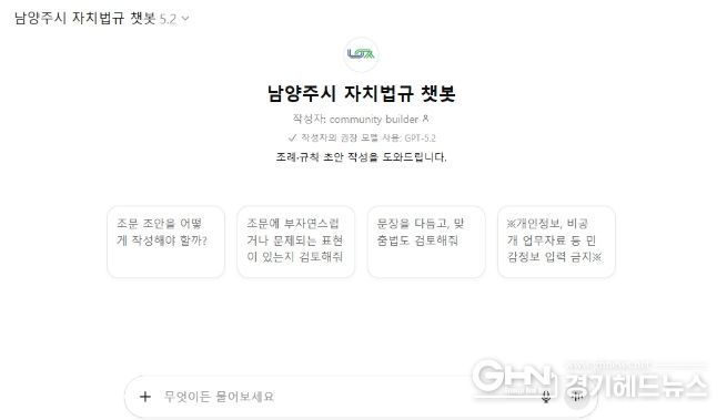 ‘남양주시 자치법규 챗봇’은 생성형 AI 기술을 기반으로 법제처의 입안 지침, 사례, 문장 정비 기준, 쟁점별 해석 자료 등을 학습해 △조문 작성 △문장 검수 △입법례 제공 등 실무에 필요한 다양한 기능을 수행한다. 특히 공유재산, 보조금, 위원회 등 행정 일반 분야 중심으로 자치법규 초안을 구성할 수 있도록 대화형 서비스를 지원한다.