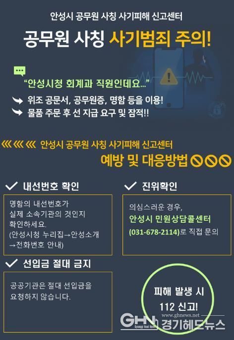 안성시 관계자는 “안성시 공무원은 어떠한 경우에도 선입금을 요구하지 않는다”며 “수상하거나 의심스러운 연락을 받았을 경우, 즉시 신고센터로 문의해 달라”고 당부했다.