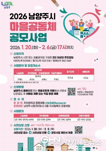 경기헤드뉴스 권민성 기자 | 남양주시는 1월 20일부터 2월 6일까지 ‘2026년 마을공동체 공모사업’참여 공동체를 공개 모집한다.
