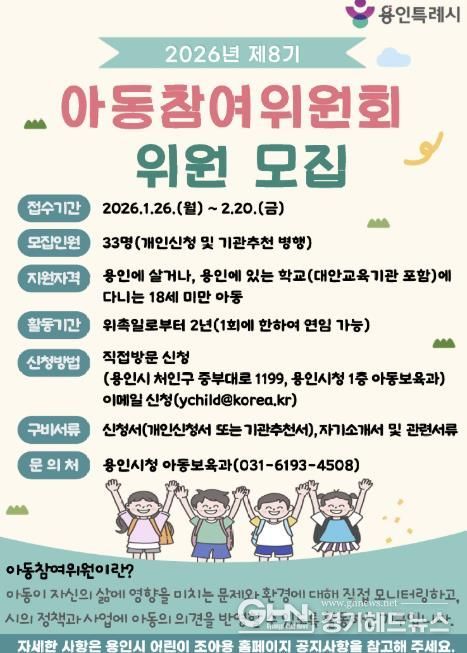 경기헤드뉴스 성미연 기자 | 용인특례시는 1월 26일부터 2월 20일까지 아동정책 수립 과정에 적접 참여할 ‘제8기 아동참여위원회‘ 위원 33명을 모집한다.