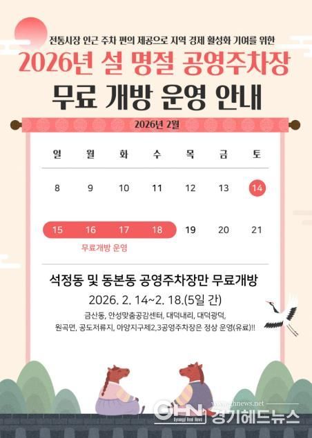 경기헤드뉴스 이현규 기자 | 안성시시설관리공단은 2026년 설 명절을 맞아 2월 14일부터 18일까지 5일간, 공단이 관리하는 공영주차장 중 전통시장 인근에 위치한 석정동 공영주차장과 동본동 공영주차장을 한시적으로 무료 개방한다고 밝혔다.