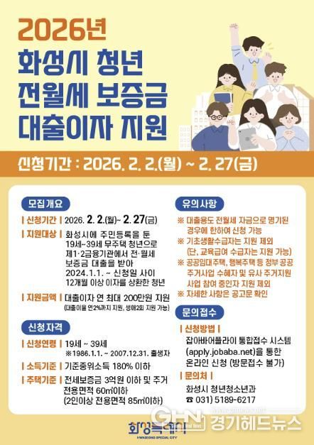 경기헤드뉴스 임수연 기자 | 화성특례시(시장 정명근)가 2일부터 오는 27일까지 청년들의 주거비 부담 경감 및 정주 여건 향상을 위해 ‘청년 전·월세 보증금 대출이자 지원사업’ 신청을 받는다.