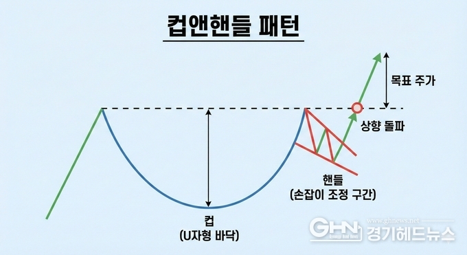 차트상 주가가 U자형 바닥(컵)을 만든 뒤 잠시 조정을 거치는 '핸들(손잡이)' 구간이 바로 핵심적인 눌림목이다. 이 조정 구간을 지나 저항선을 상향 돌파할 때 강력한 상승 에너지가 응집된다. 오늘 한화에어로스페이스가 보여준 흐름은 바로 이 상승 시나리오의 정점에 해당한다.