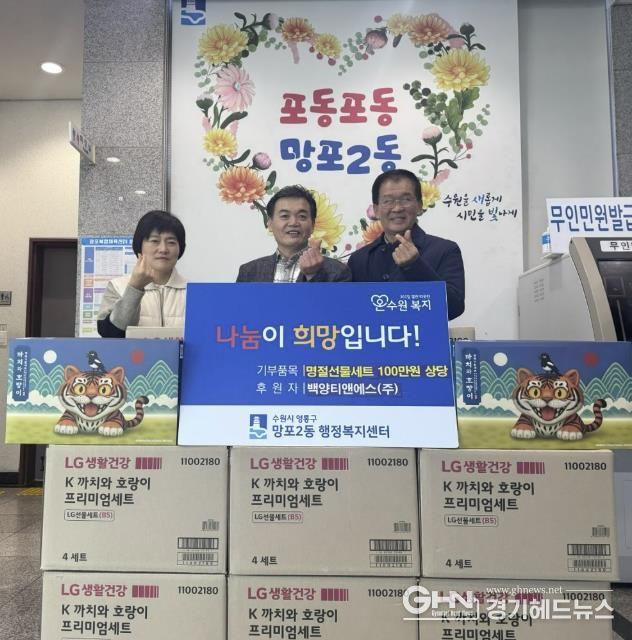 경기헤드뉴스 권준형 기자 | 영통구 망포2동 행정복지센터는 지난 3일 백양티앤에스(주)가 설 명절을 맞아 100만 원 상당의 명절 선물세트를 망포2동 취약계층을 위해 기탁했다고 밝혔다.