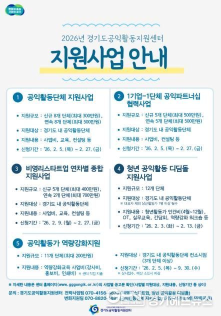 경기헤드뉴스 성미연 기자 | 경기도공익활동지원센터가 ‘2026년 경기도 공익활동 지원사업’에 참여할 도내 공익활동 단체를 모집한다.