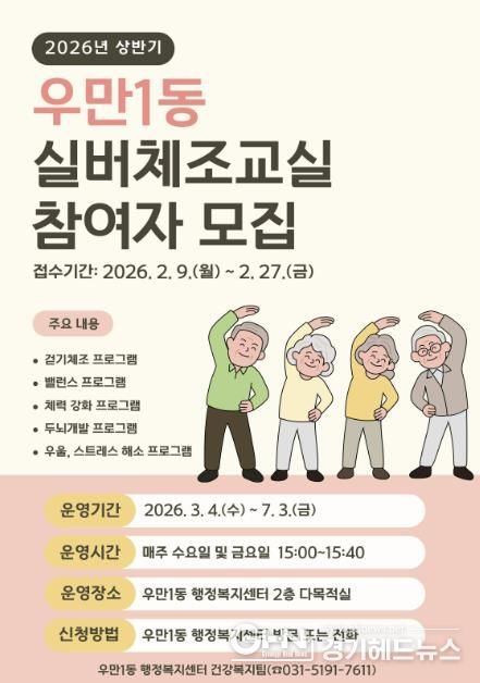 경기헤드뉴스 권준형 기자 | 수원시 팔달구 우만1동은 관내 어르신들의 건강 증진을 위해 2월 9일부터 2월 27일까지 ‘2026년 상반기 실버체조교실’ 참여자를 선착순으로 모집한다고 밝혔다.
