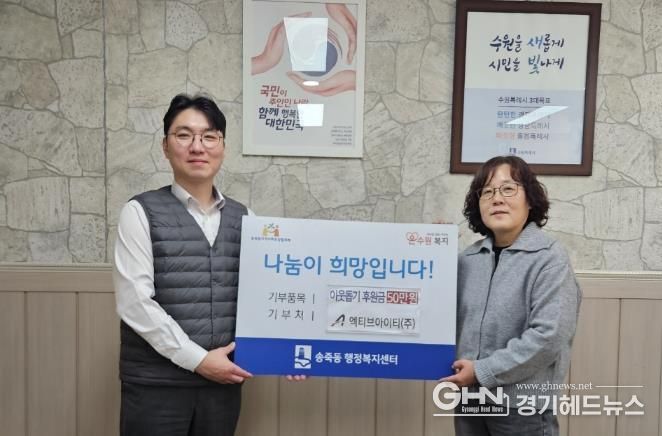 경기헤드뉴스 권준형 기자 | 수원시 장안구 송죽동 행정복지센터는 ㈜엑티브아이티에서 지난 12일, 설 명절을 맞아 취약계층을 위한 후원금을 기탁했다고 밝혔다.