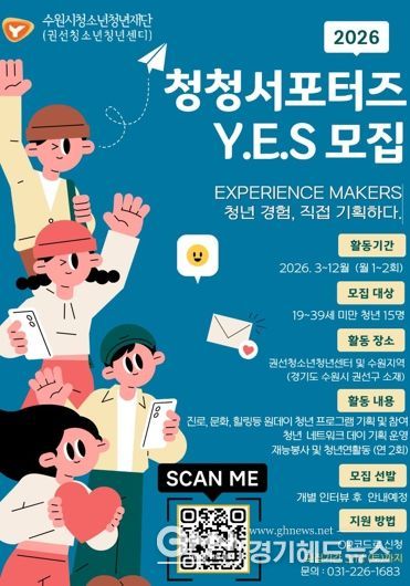 경기헤드뉴스 권준형 기자 | 수원시청소년청년재단 권선청소년청년센터는 청년이 문화 프로그램의 기획과 운영 과정에 주도적으로 참여하며 또래 간 네트워크를 형성하고, 이를 통해 지역사회에 긍정적인 에너지를 확산할 수 있도록 돕는 '2026 청청서포터즈 YES(Youth Energy Supporters)' 참가자를 모집한다.
