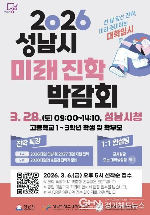 경기헤드뉴스 권준형 기자 | 성남시청소년청년재단은 오는 3월 28일 오전 9시부터 오후 2시 10분까지 성남시청에서 '2026 성남시 미래진학박람회'를 개최한다고 밝혔다. 이번 박람회는 성남시 고등학교 1~3학년 학생과 학부모를 대상으로 진행된다.