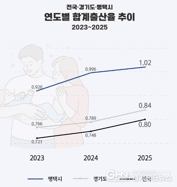 국가데이터처가 발표한 2025년 잠정 합계출산율에 따르면 평택시는 2024년 0.996에서 2025년 1.02로 상승하며 다시 1.0명을 넘어섰다. 2023년(0.92) 이후 2년 연속 상승이다.
