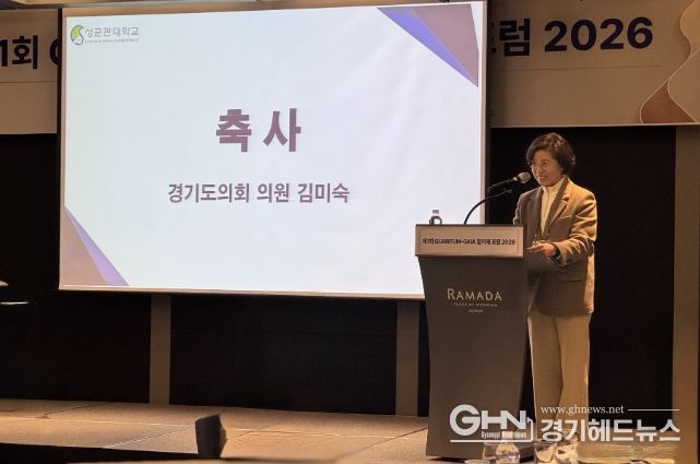 경기헤드뉴스 성미연 기자 | 경기도의회 미래과학협력위원회 김미숙 의원(더불어민주당, 군포3)은 26일 수원 라마다프라자호텔에서 열린 ‘제1회 QUANTUM-GAIA 협의체 포럼 2026’에 참석해 축사를 전하고, 양자산업 생태계 조성을 위한 협력 필요성을 강조했다.