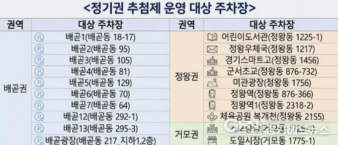 이번 추첨 대상 공영주차장은 배곧권의 배곧1~7호, 배곧12~13호, 배곧광장 10개소와 정왕권의 어린이도서관, 정왕우체국, 경기스마트고, 군서초교, 미관광장, 정왕역, 정왕역1, 체육공원 복개천 8개소, 거모권의 거모중앙, 도일시장 주차장 2개소를 포함하여 총 20개소다.