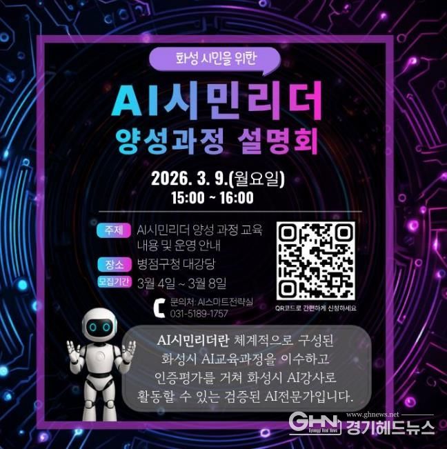경기헤드뉴스 임수연 기자 | 화성특례시는 시민이 학습하고 교육하는 인공지능(AI) 학습 체계 구축을 위해 ‘2026년 AI시민리더 양성 교육’ 설명회를 3월 9일 오후 3시에 병점구청 대강당에서 개최한다.