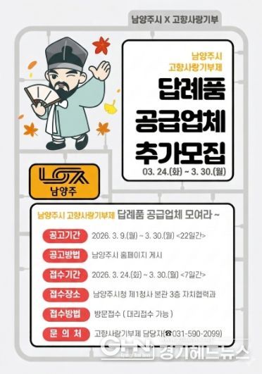 경기헤드뉴스 권민성 기자 | 남양주시는 오는 3월 24일부터 고향사랑기부제 참여자들에게 제공할 ‘2026년 고향사랑기부제 답례품 공급업체’ 추가 모집 접수를 시작한다고 6일 밝혔다.