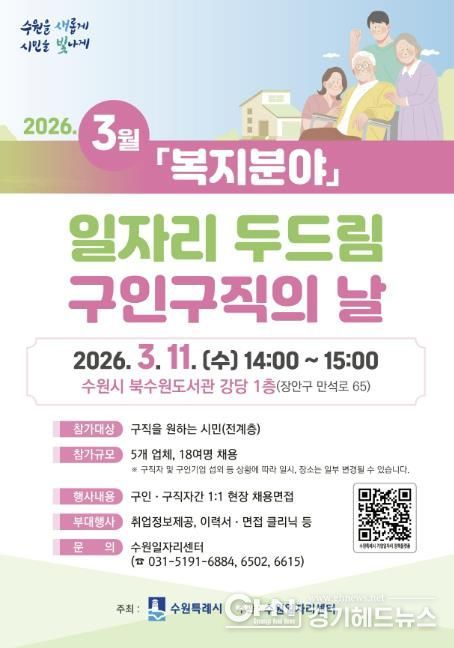 경기헤드뉴스 권준형 기자 | 수원특례시는 3월 11일 오후 2시부터 3시까지 북수원도서관 강당에서 ‘3월 일자리 두드림 구인·구직의 날’을 개최한다.