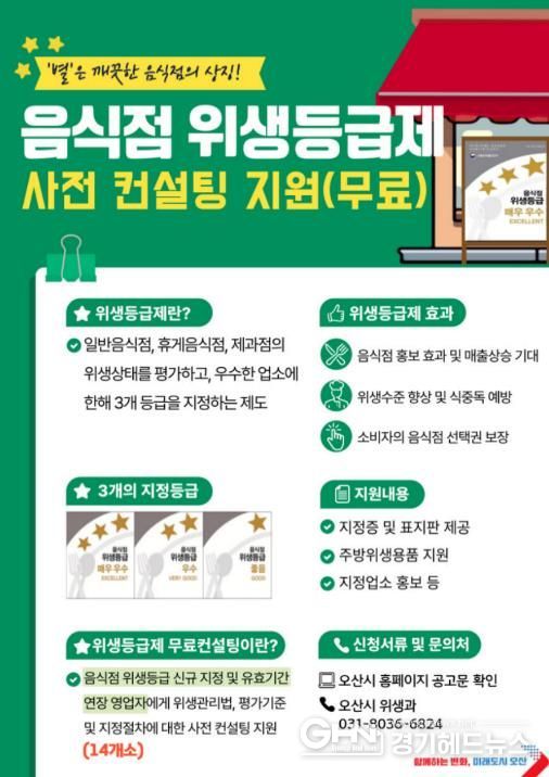 경기헤드뉴스 임수연 기자 | 오산시는 관내 음식점의 위생 수준 향상과 안전한 외식환경 조성을 위해 ‘음식점 위생등급제(식품안심업소) 사전 컨설팅’ 참여 업소를 모집한다고 10일 밝혔다.