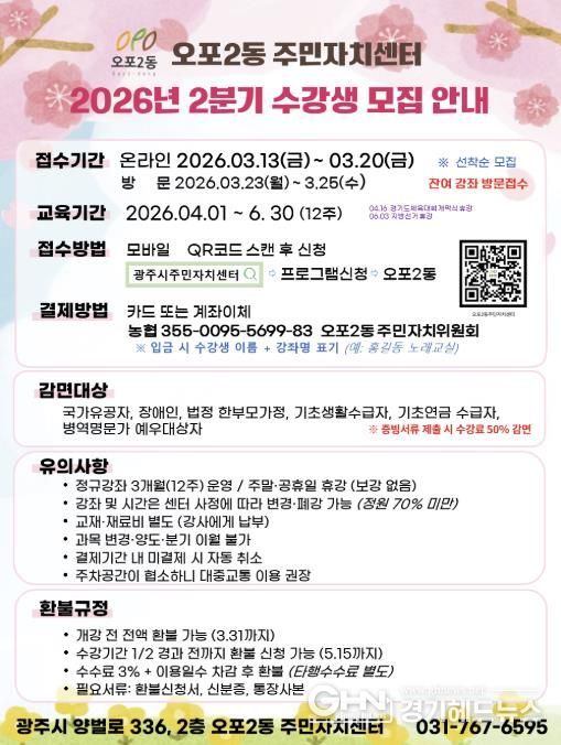 경기헤드뉴스 권민성 기자 | 광주시 오포2동 주민자치센터는 오는 4월 1일 개관을 앞두고 3월 13일부터 20일까지 ‘2026년 2분기 주민자치 프로그램’ 수강생 924명을 선착순 모집한다.