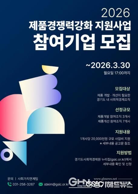 경기헤드뉴스 성미연 기자 | 경기도와 경기도사회적경제원이 오는 30일까지 ‘제품 경쟁력 강화 지원사업’에 참여할 사회적경제조직을 모집한다.