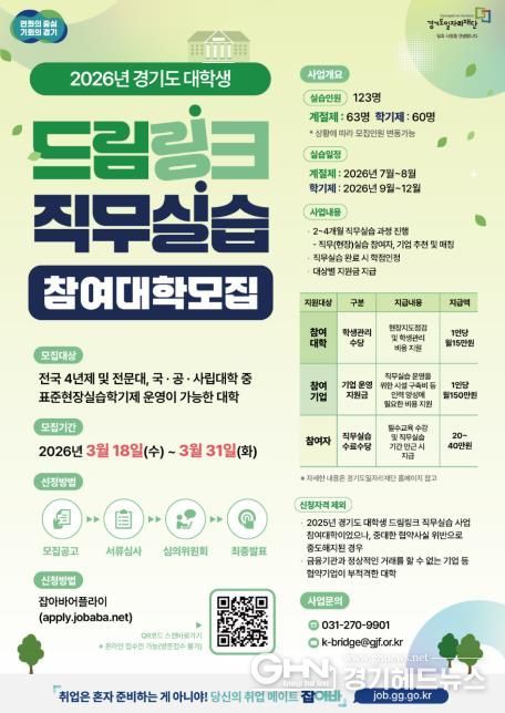 경기헤드뉴스 성미연 기자 | 경기도와 경기도일자리재단이 ‘경기도 대학생 드림링크 직무실습’ 사업에 참여할 15개 협력대학을 31일까지 모집한다.