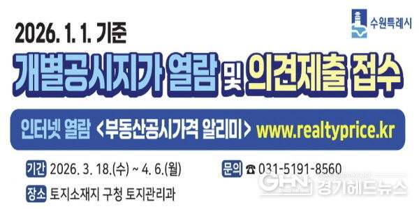 경기헤드뉴스 권준형 기자 | 수원시 영통구는 3월 18일부터 4월 8일까지 20일간 2026년 1월 1일 기준 개별공시지가에 대한 열람을 실시하고 토지소유자 및 이해관계인의 의견을 접수한다.