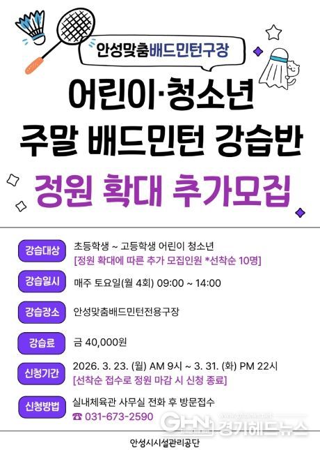 경기헤드뉴스 이현규 기자 | 안성시시설관리공단은 안성 시민 생활체육 활성화를 위해 현재 운영 중인 주말 어린이・청소년 배드민턴 강습반 정원을 확대하고 추가 수강생을 모집한다고 밝혔다.