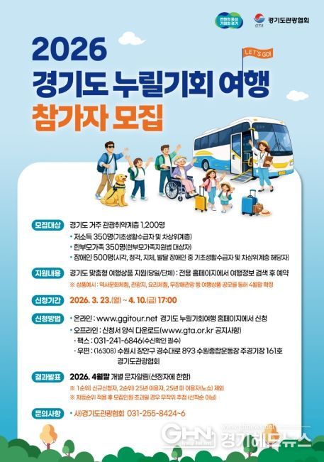 참여를 희망하는 도민은 경기도누릴기회여행 누리집을 통해 신청할 수 있으며, 경기도관광협회 누리집 공지사항을 참고해 팩스 또는 우편으로도 접수할 수 있다.