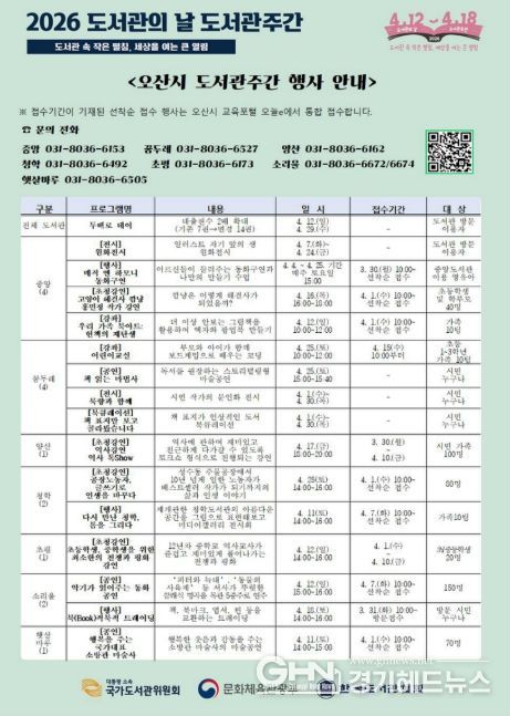 경기헤드뉴스 임수연 기자 | 오산시는 2026년 도서관의 날(4월 12일)과 도서관주간(4월 12일~4월 18일)을 맞아 시민 누구나 참여할 수 있는 다양한 독서문화 행사를 운영한다고 밝혔다.