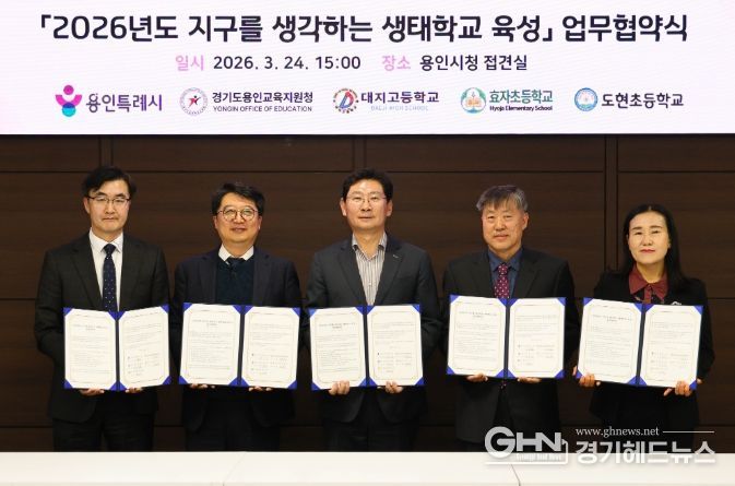 경기헤드뉴스 성미연 기자 | 용인특례시는 24일 시청 접견실에서 용인교육지원청을 비롯해 3개 학교와 ‘지구를 생각하는 생태학교 육성사업’을 위한 협약을 맺었다.