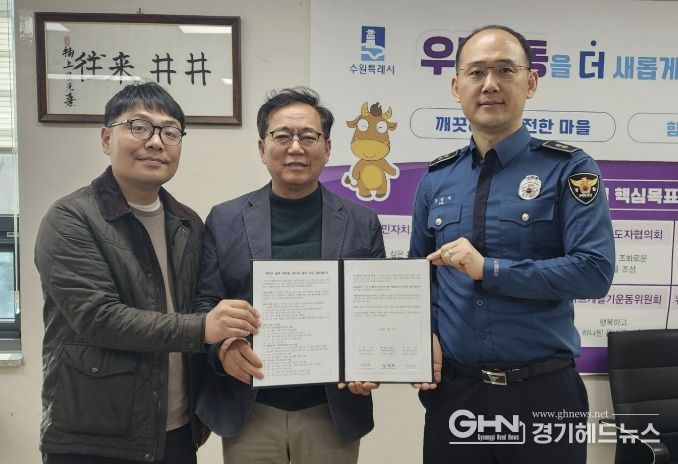 경기헤드뉴스 권준형 기자 | 수원시 팔달구 우만1동은 2026년 3월 27일, 주민 생활안전 강화를 위한 ‘어두운 골목 태양광 센서등 설치사업’의 원활한 추진을 위해 우만1동 행정복지센터·우만1동 주민자치회·팔달경찰서 간 서면 업무협약을 체결했다.